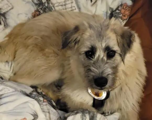 Die mittelgroße Hündin hat mit ihrem strubbeligen Fell und ihren treuen, gutmütigen Augen ein sehr hübsches Aussehen.